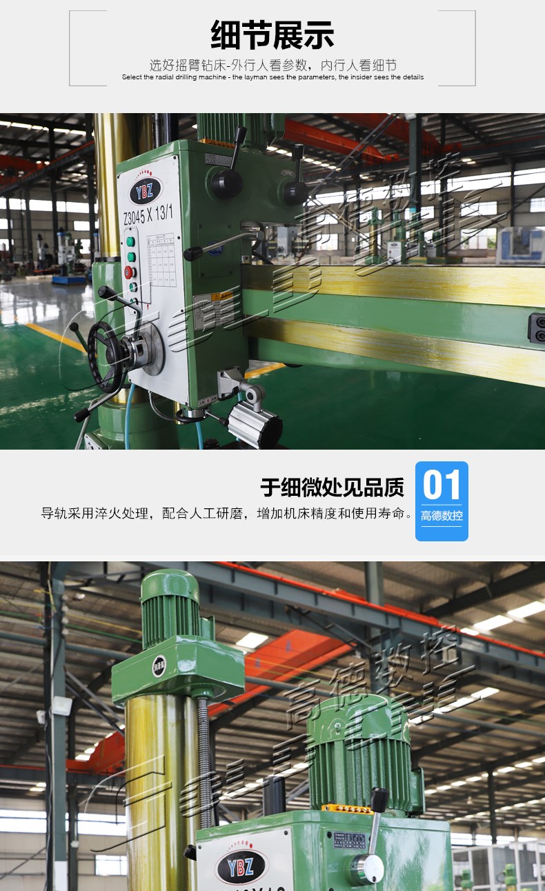經典的孔(kǒng)加工設備,鑽孔直徑:鋼件Φ38mm/鑄件(jiàn)Φ45mm,內立柱固定(dìng)於底座一端,外立(lì)柱可(kě)繞其360°回轉,實(shí)現全(quán)方位加工覆(fù)蓋。外立柱套(tào)在內立柱外(wài)側,與搖臂聯(lián)動(dòng);搖(yáo)臂通過套筒套裝在外立柱上,可(kě)沿其上下