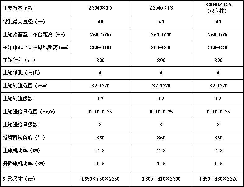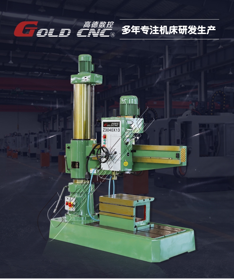 由(yóu)主軸電機驅動主軸及(jí)刀具(如鑽頭)旋轉,實現(xiàn)材料切削,主軸沿軸向直線(xiàn)移動(手動(dòng)/自動),使刀具向工件進(jìn)給,控製鑽孔深度。搖臂升降(調整高(gāo)度)、主軸箱徑向移動(調整徑向位置)、搖臂回轉(調整周向位置),